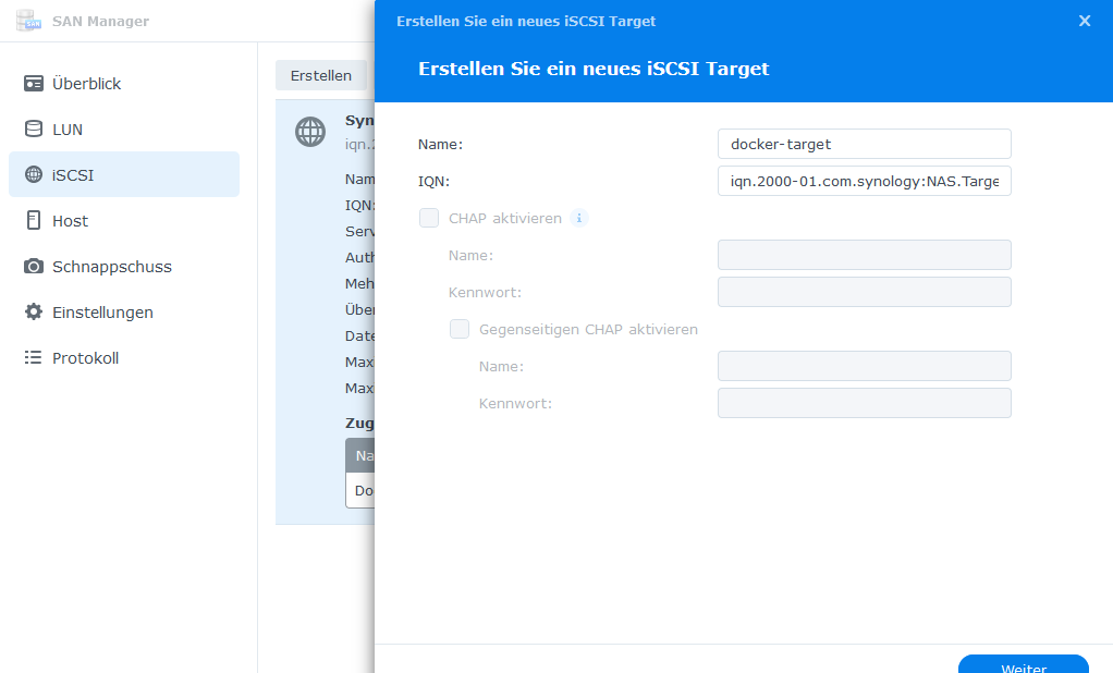 Als erstes muss ein iSCSI-Target angelegt werden. Mit einem Klick auf erstellen wird ein Wizard gestartet, der im ersten Schritt einen Namen einfordert und eine IQN erstellt.