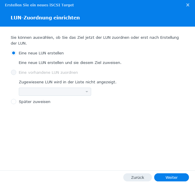Im zweiten Schritt wird entweder eine bestehende LUN zugewiesen oder eine neue erstellt.