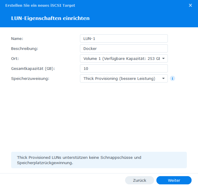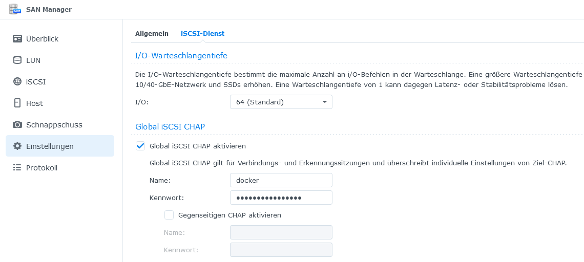 Nun aber zur Installation. Als erstes sollte man auf seinem NAS ein iSCSI Target und eine LUN konfigurieren. Ich beschreibe die Konfiguration für ein Synology NAS mit DSM 7 als Betriebssystem. Die Konfiguration erfolgt im SAN-Manager.