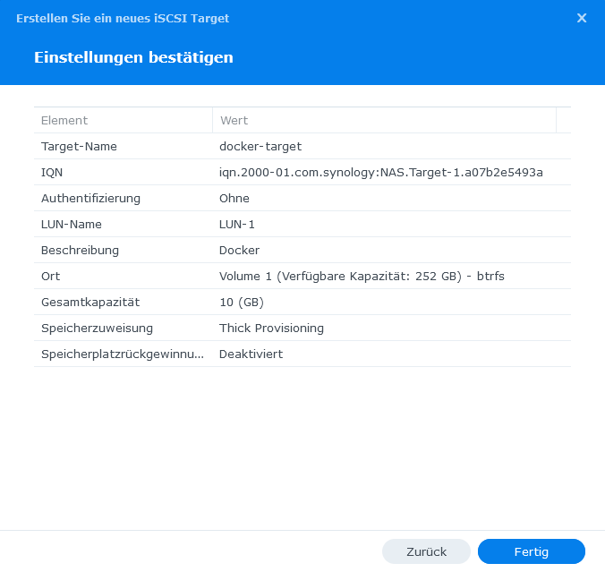 Im letzen Schritt gibt es noch eine Zusammenfassung der Einstellungen und sowohl die LUN als auch das Target werden angelegt.