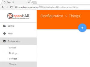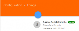 Die Konfiguration des Z-Wave Bindings erfolgt durch das Hinzufügen des Z-Wave Controllers unter „Configuration/Things“. Durch Klicken auf das „+“ – Zeichen.