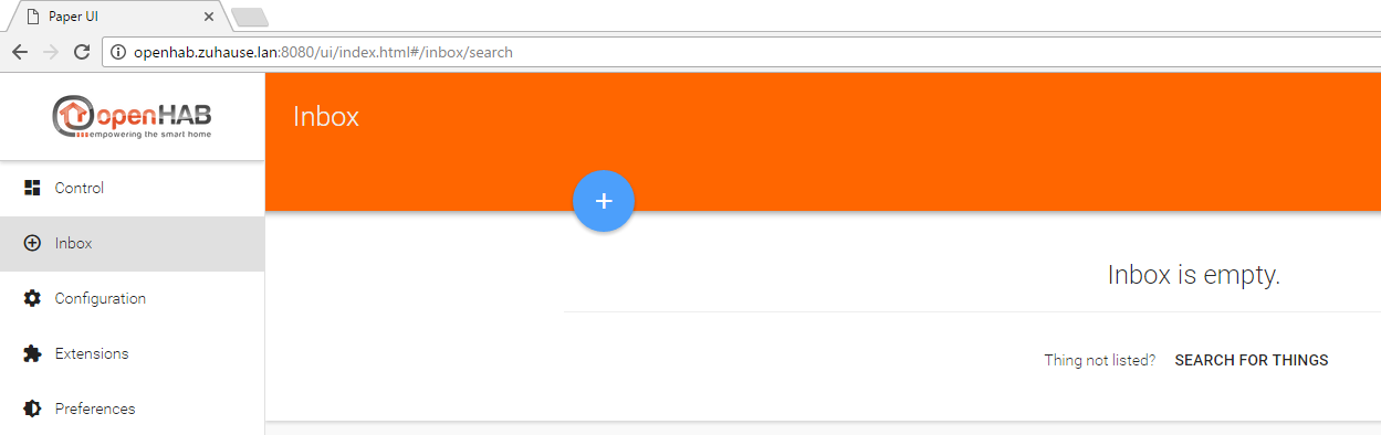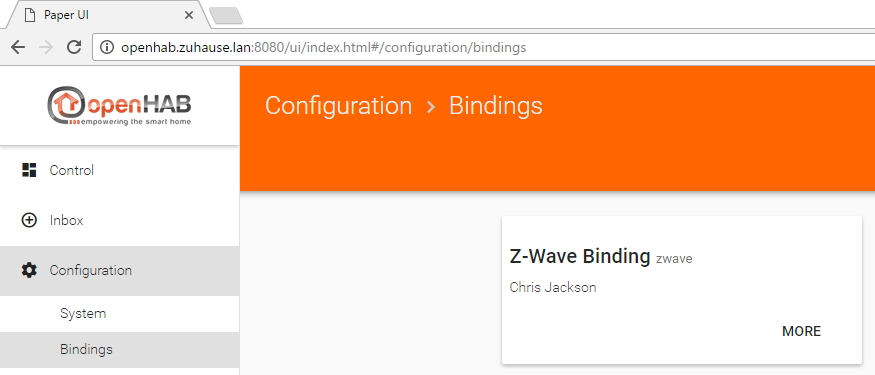 Das Grundsystem von OpenHAB 2 ist installiert und funktioniert, nun muss es mit Leben gefüllt werden. Als erstes soll das Z-Wave Binding installiert und konfiguriert werden.Um auf die Webseite des gerade installierten OpenHAB 2 zu gelangen, kann man im Brwoser entweder http://<IP-Adresse>:8080 oder den DNS-Namen des Server/VM gefolgt vom Port8080 eingeben.