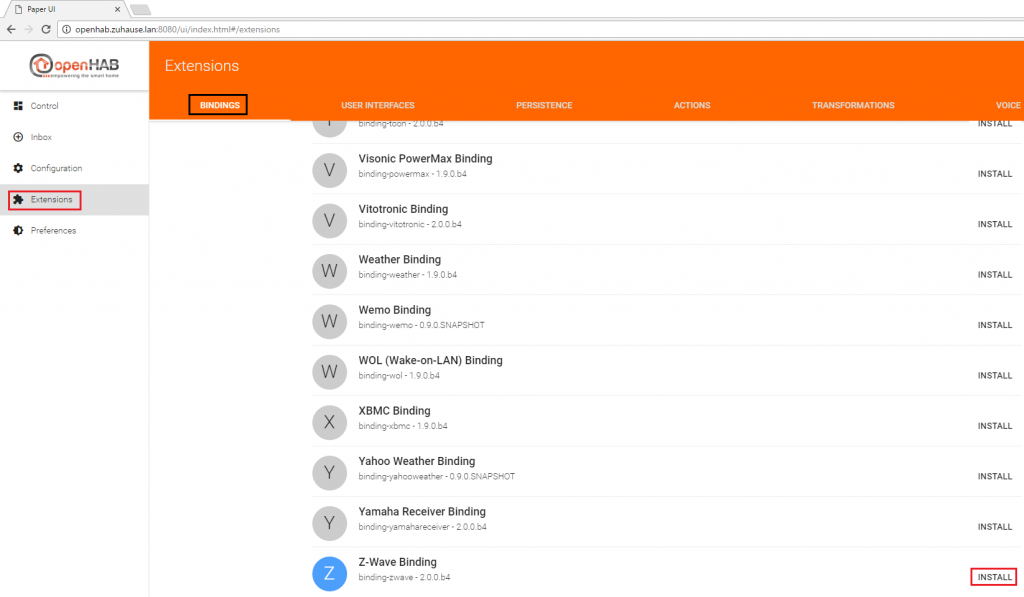 Nun kann man in den Extensions im Menüpunkt Binding das Z-Wave Binding auswählen.